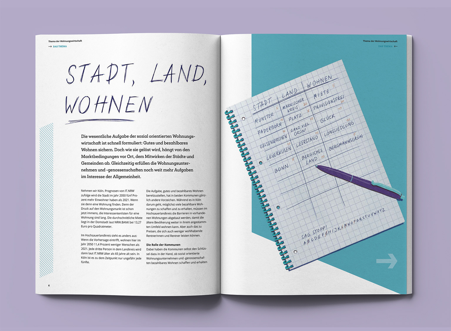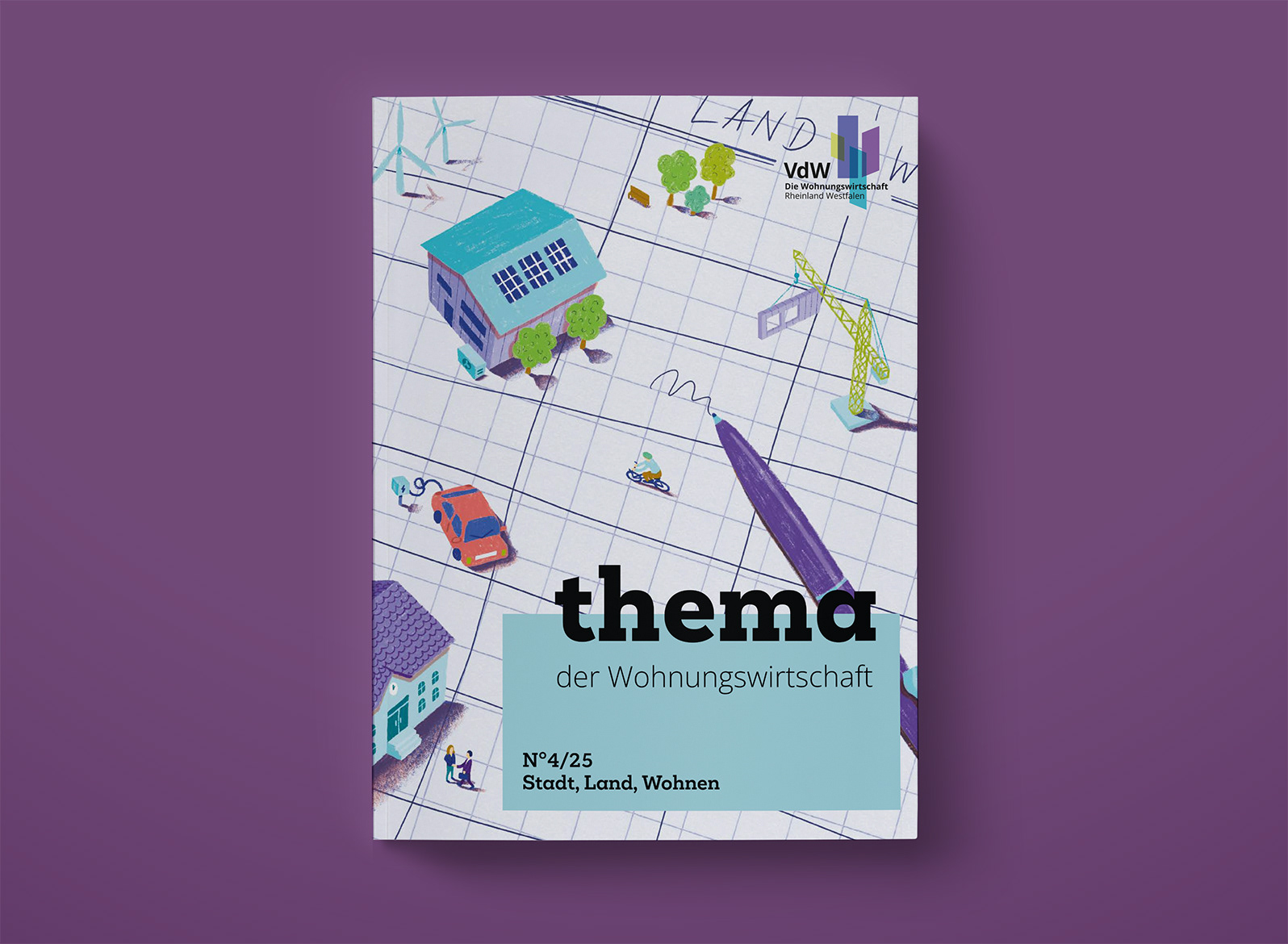 Das neue Verbandsmagazin des Verband der Wohnungswirtschaft Rheinland Westfalen, welches seit Januar 2024 vierteljährlich erscheint, ist geprägt von einem veränderten grafischen, aber auch journalistischen Anspruch. Insbesondere die Covergestaltung soll im Vergleich zu branchentypisch abwechslungslosen Zeitschriften herausstechen. In meiner Zeit beim Verband hatte ich die Möglichkeit gleich sechs der Cover selbst zu gestalten und die Gestaltungsrichtung der anderen zwei stark zu lenken. Alle Ausgaben sind hier zu finden.