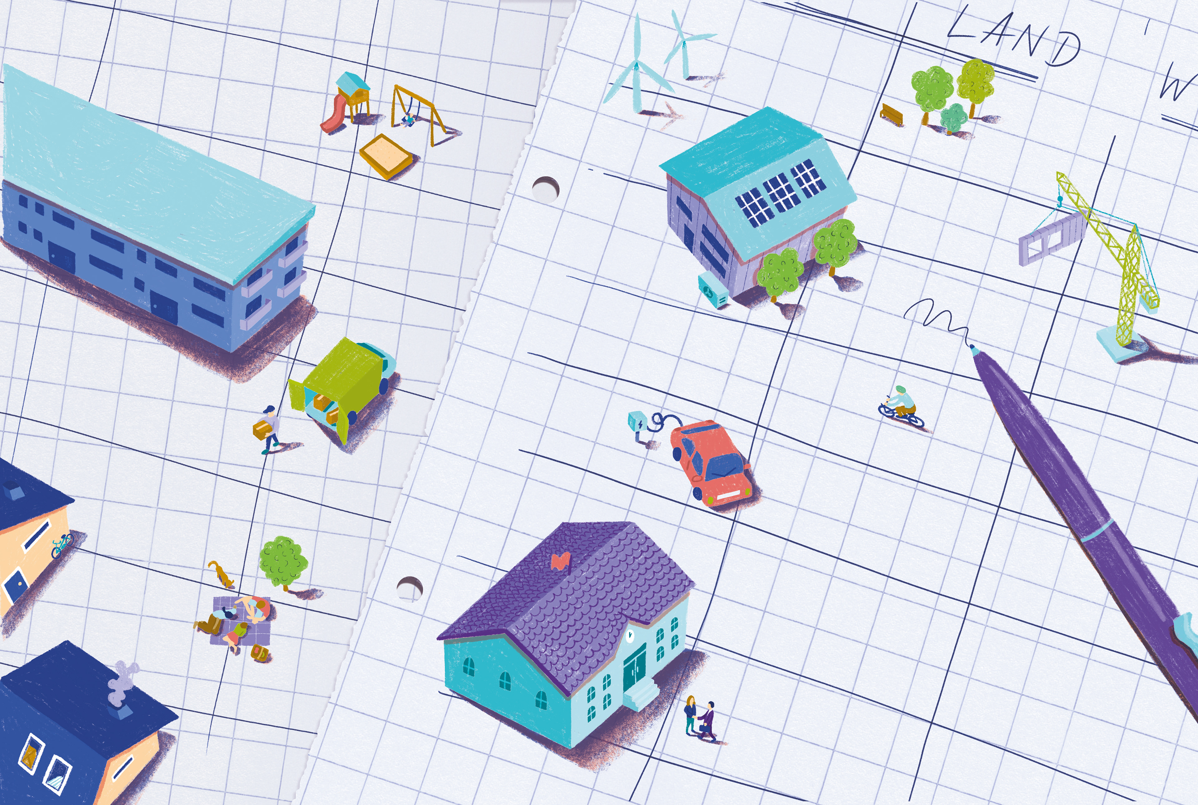 Die achte Ausgabe "Stadt, Land, Wohnen" konzentrierte sich auf die Aufgabe der sozial orientierten Wohnungswirtschaft auf dem Land im Vergleich zur Stadt. Die Inspiration für die Gestaltung war das Spiel "Stadt, Land, Fluss" was oft auf einem einfachen Papierblock mit selbst gezeichnetem Raster gespielt wird. Daraus entstand die Idee, eine Miniatur-Welt zum Thema Wohnen auf dem Papier zu erschaffen.