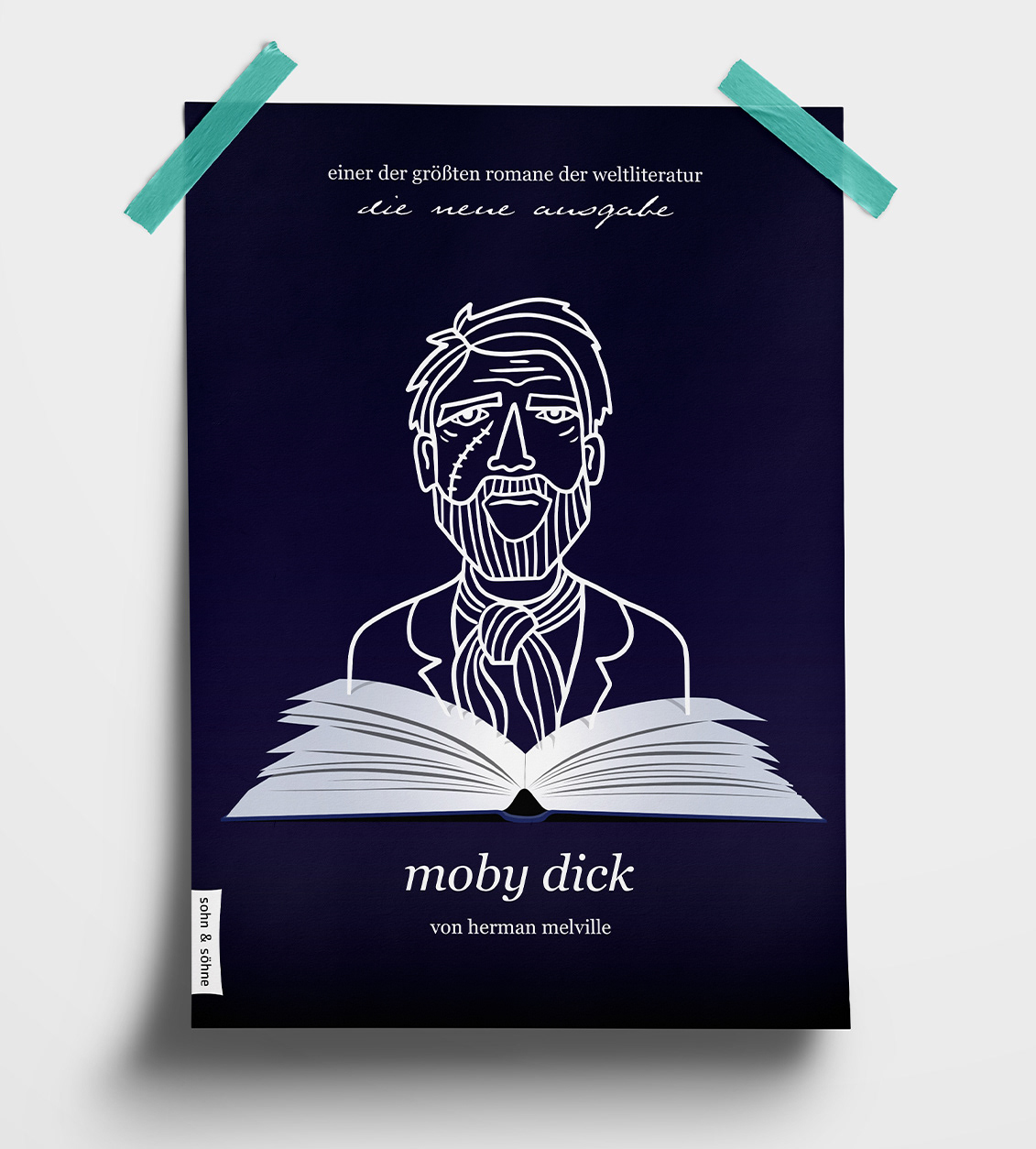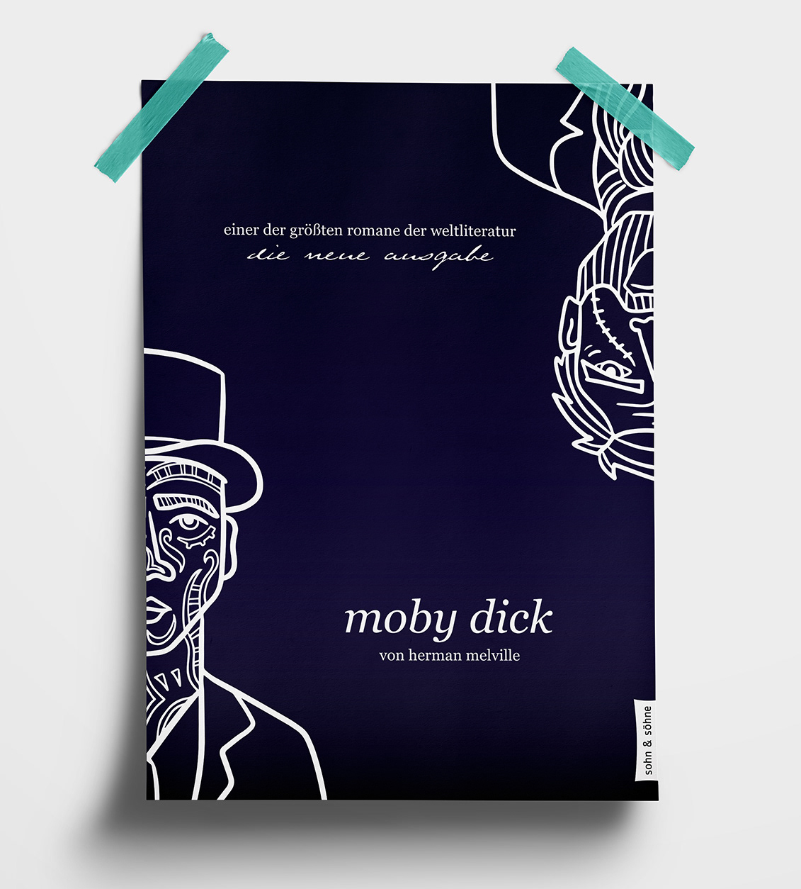 Im Rahmen eines einwöchigen Blockseminars hatte ich die Aufgabe, das Buchcover des Romans Moby Dick neuzugestalten. Die einzige Regel war, keinen Wal, kein Fischerbot oder Harpune abzubilden. Hierfür habe ich Illustrationen für sechs der im Buch beschriebenen Besatzungsmitglieder gezeichnet. Zusätzlich zur Neugestaltung des Buchumschlags, wurden zwei Plakate entworfen.