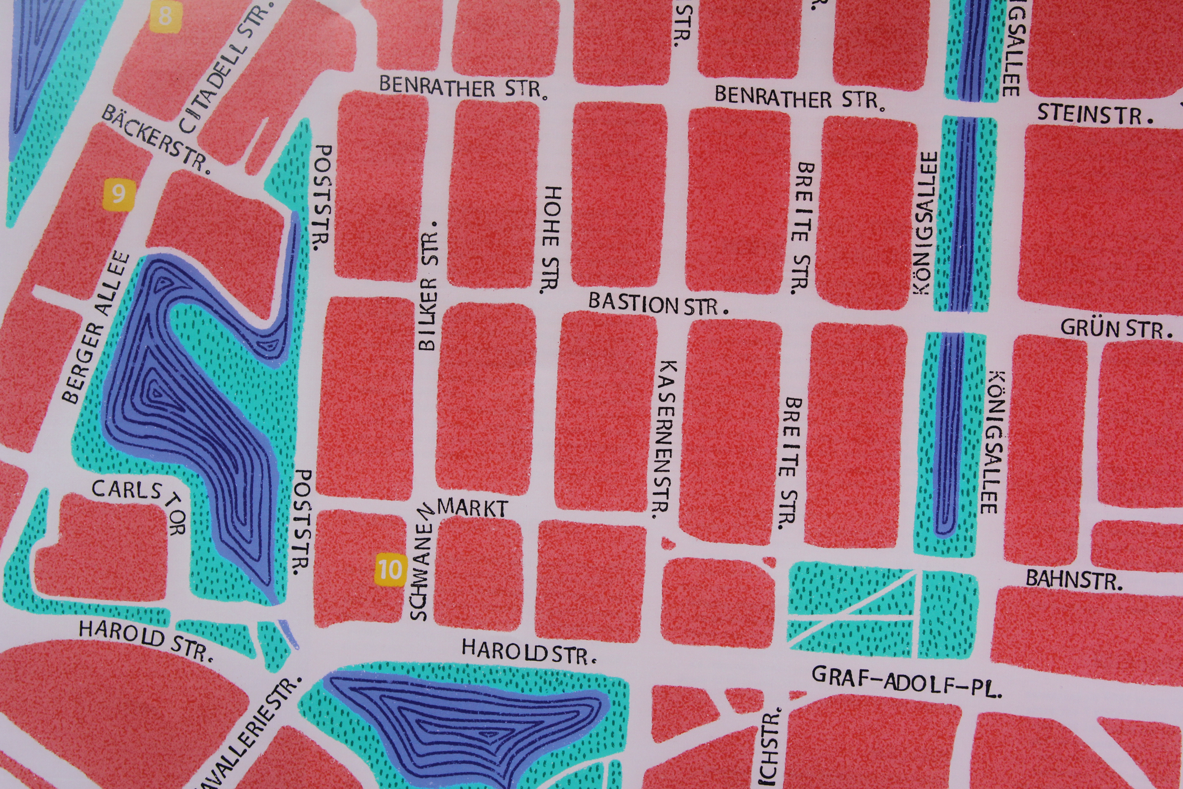 Im Rahmen eines “Urbanen Wandern” Kurses bei Andreas Uebele in meinem 6. Semester entstand ein Stadtführer zu Stolpersteinen, die in den Boden eingelassenen Gedenktafeln, die an die Opfer der NS-Zeit erinnern sollen. Die Idee für das Projekt kam mir, da ich, immer wenn ich vor einem Stolperstein stehe, gerne mehr über den Menschen erfahren möchte als ihren Geburts- und Todestag. Also gestaltete ich eine Faltkarte, mit der man durch die Düsseldorfer Altstadt gehen kann und die individuellen Lebensgeschichten von 20 Opfern kennenlernen kann. Die Typografie hierfür habe ich 100% selbstgestempelt und die Karte ist digital gezeichnet.