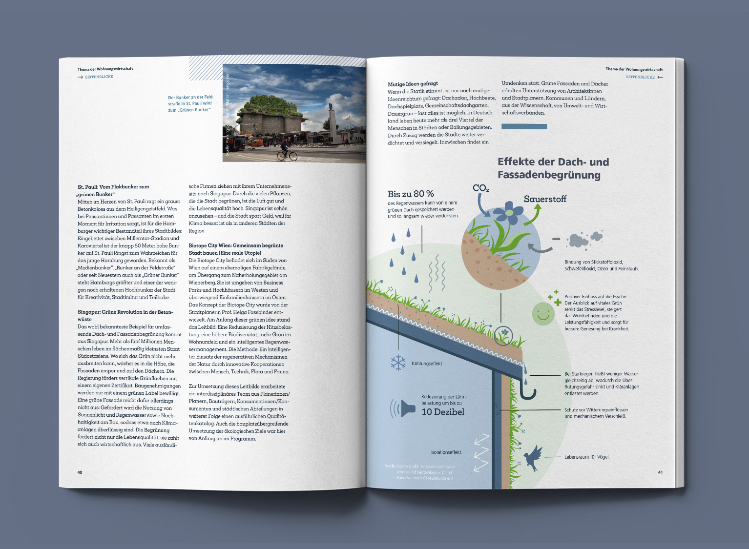 Für einen Seitenblick Artikel über grüne Oasen in Städten entstand eine Infografik über die Vorteile von Fassaden- und Dachbegrünung für Wohnungsunternehmen.