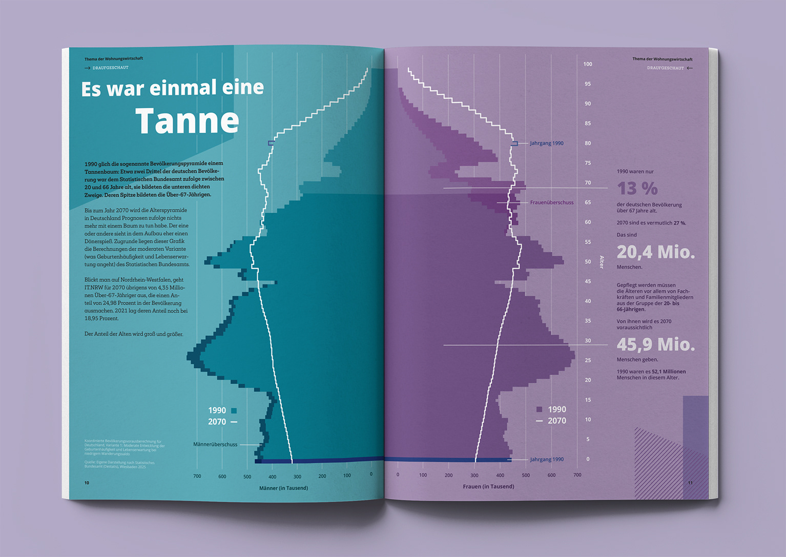 Die letzten Ausgabe des Verbandsmagazins "thema der Wohnungswirtschaft", an der ich mitarbeitete, behandelte den demographischen Wandel. Die hierfür entstandene Vektorgrafik "Es war einmal eine Tanne" beschäftigt sich mit der Veränderung der Altersstruktur in Deutschland auf visueller Ebene.