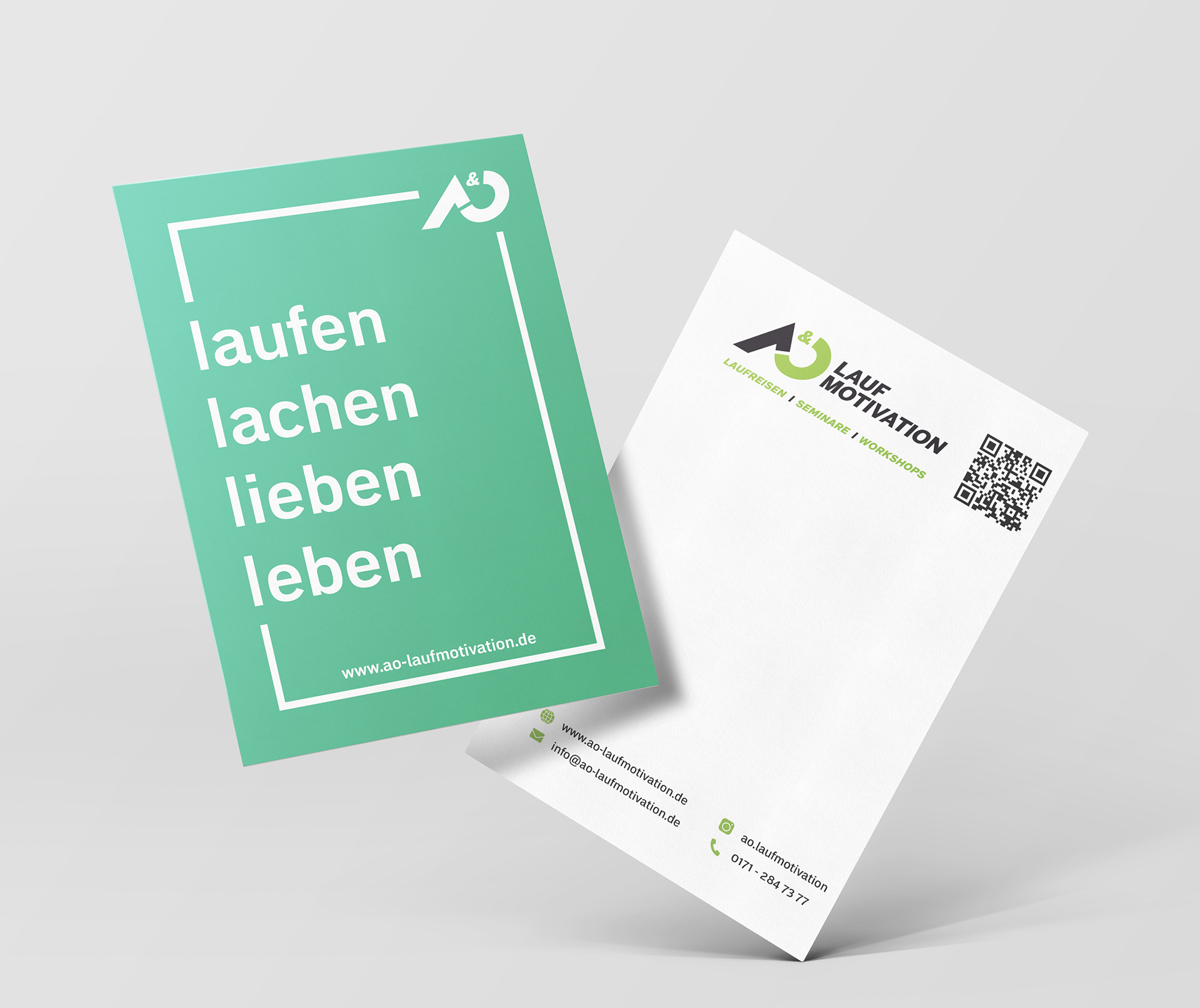 Für das kleine Unternehmen A&O Laufmotivation entstanden zwei Rollups und Postkarten zur Bewerbung ihrer Laufreisen, -kurse und Workshops.